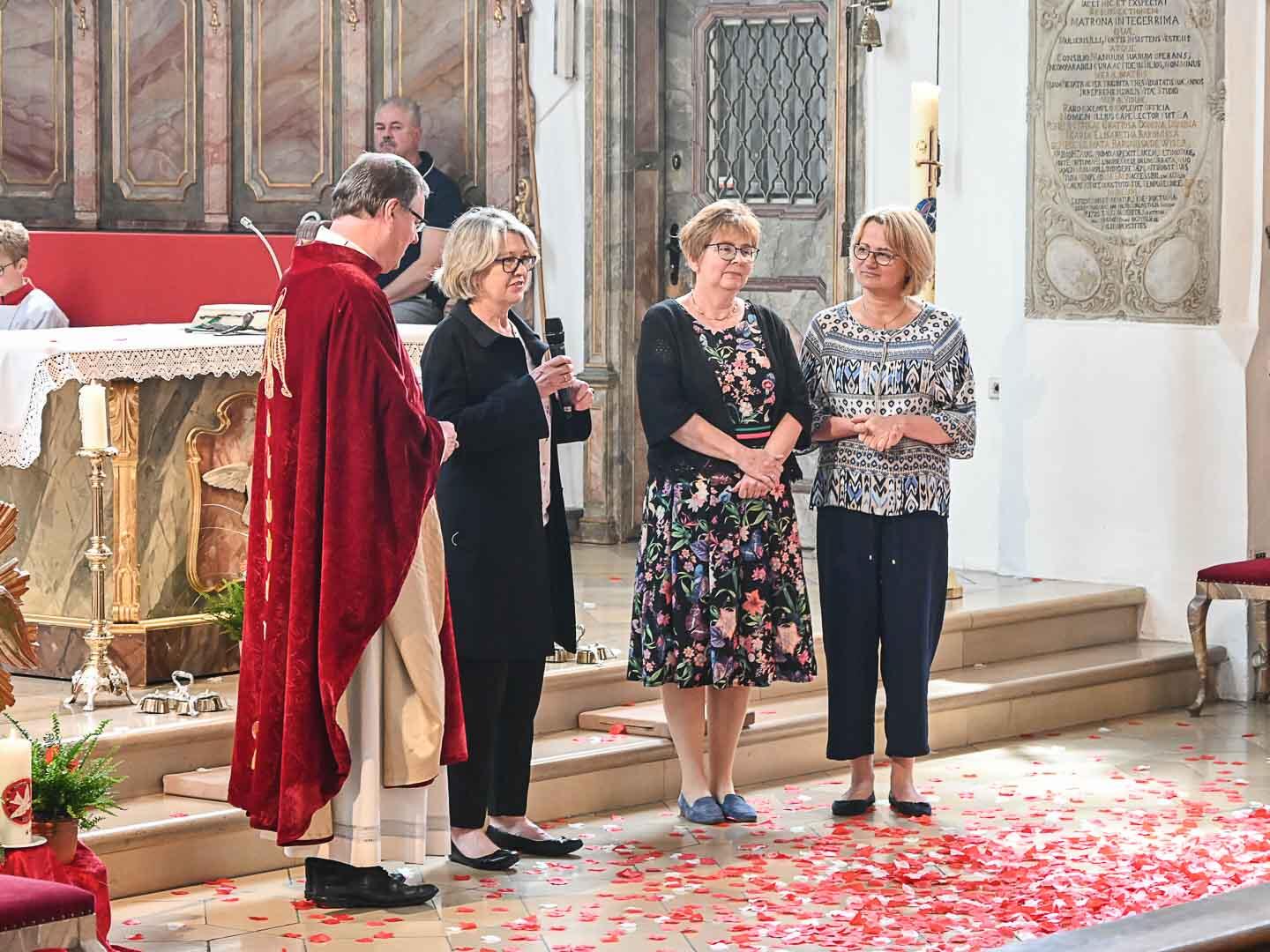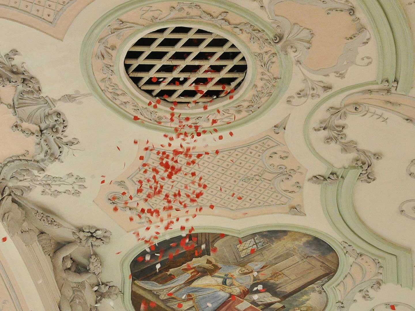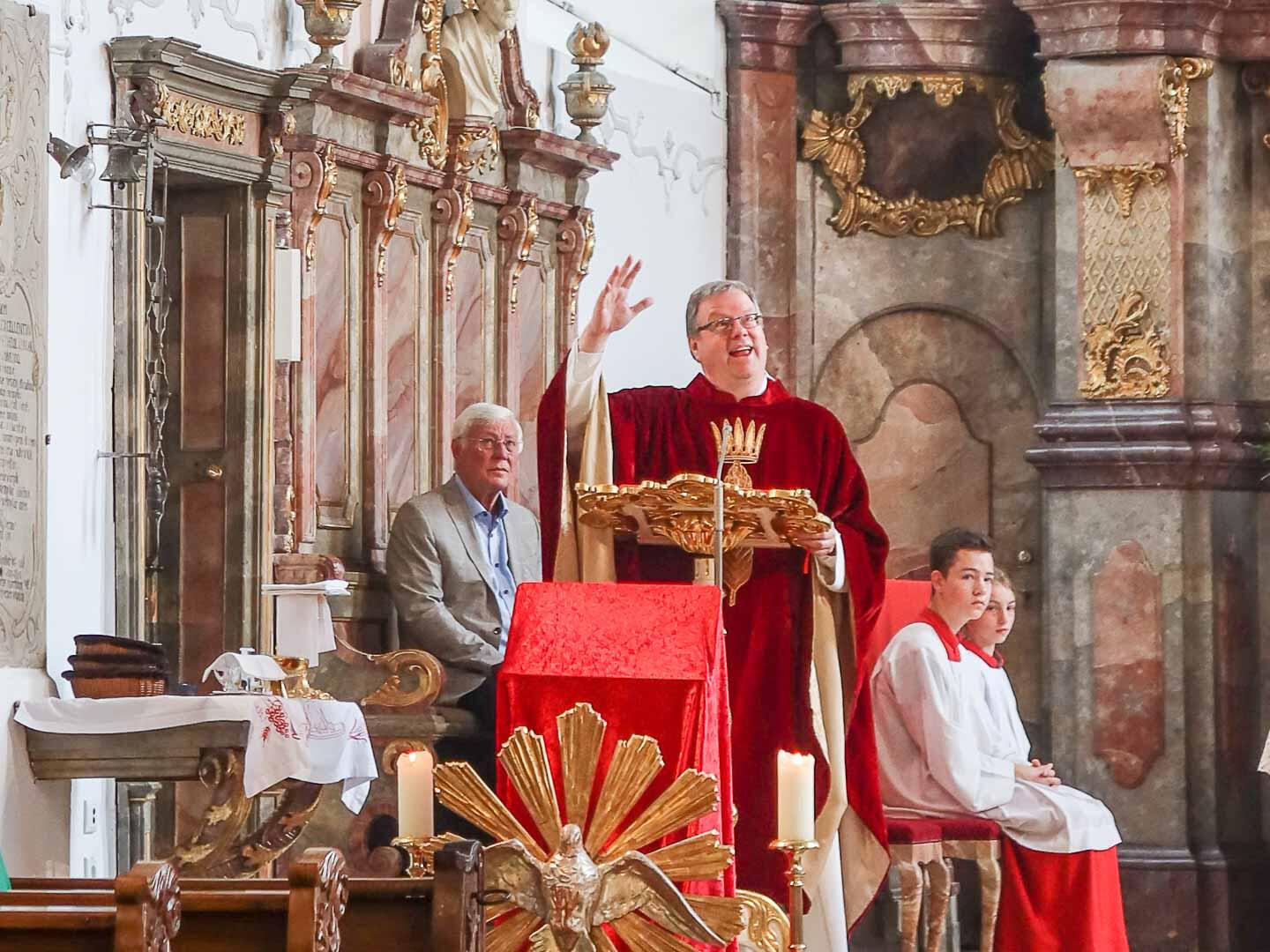 In seiner Ansprache beschrieb der Stadtpfarrer, wie das Pfingstfest im Pantheon in Rom gefeiert werde: Durch die Öffnung in der Kuppel würden Tausende Rosenblätter auf die Besucher herunterschweben.