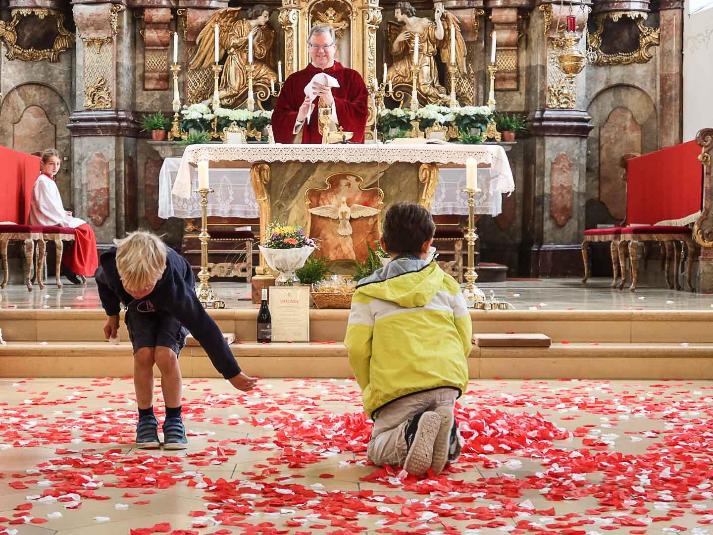 Und plötzlich segelten auch in der Hl. Geist Kirche von oben rote und weiße Blätter nach unten. In der gut besuchten Messe bestaunten nicht nur die Kinder mit großen Augen den bunten Regen.