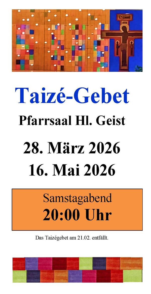Bitte beachten Sie: Die Taizé-Gebete finden bis auf Weiteres im Pfarrsaal Hl. Geist statt.