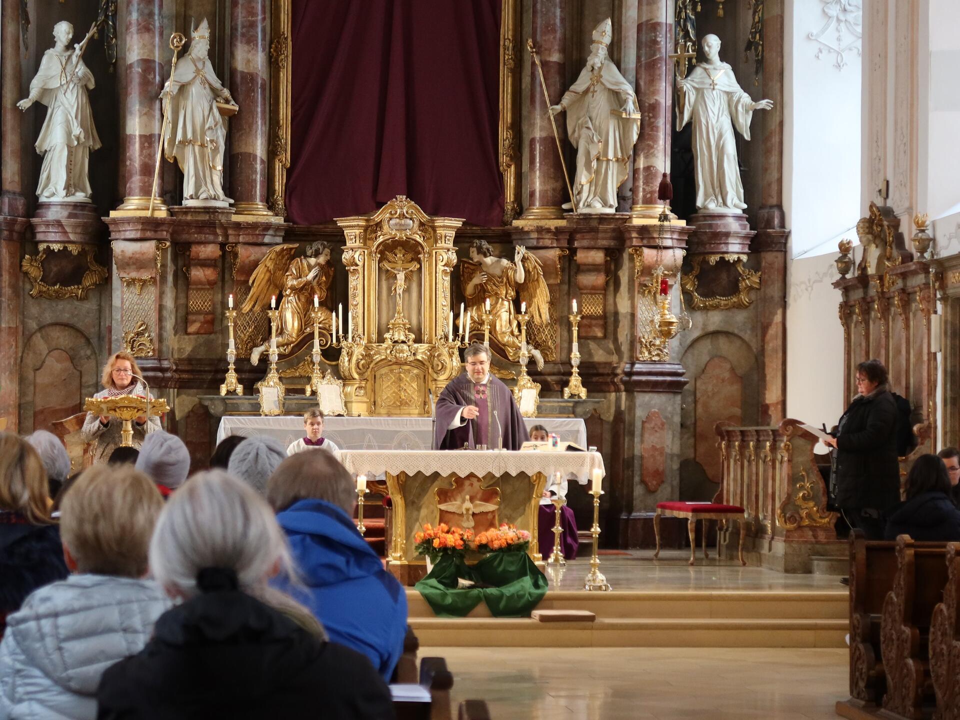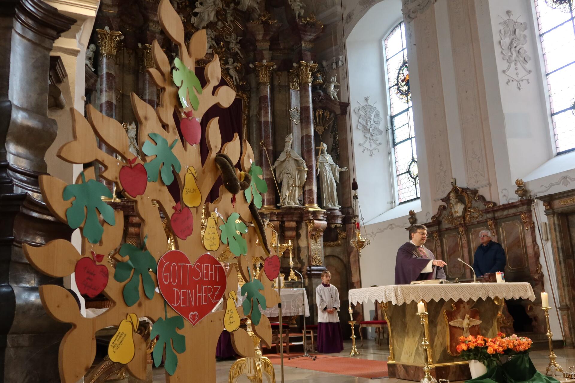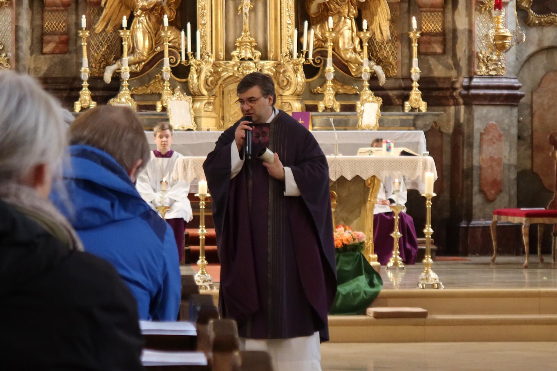 Nach der Lesung aus dem Buch Samuel, in der von der Salbung Davids durch Samuel berichtet wird, ging Dominic Leutgäb in seiner Ansprache im Gespräch mit den Kindern auf diese Geste ein.
