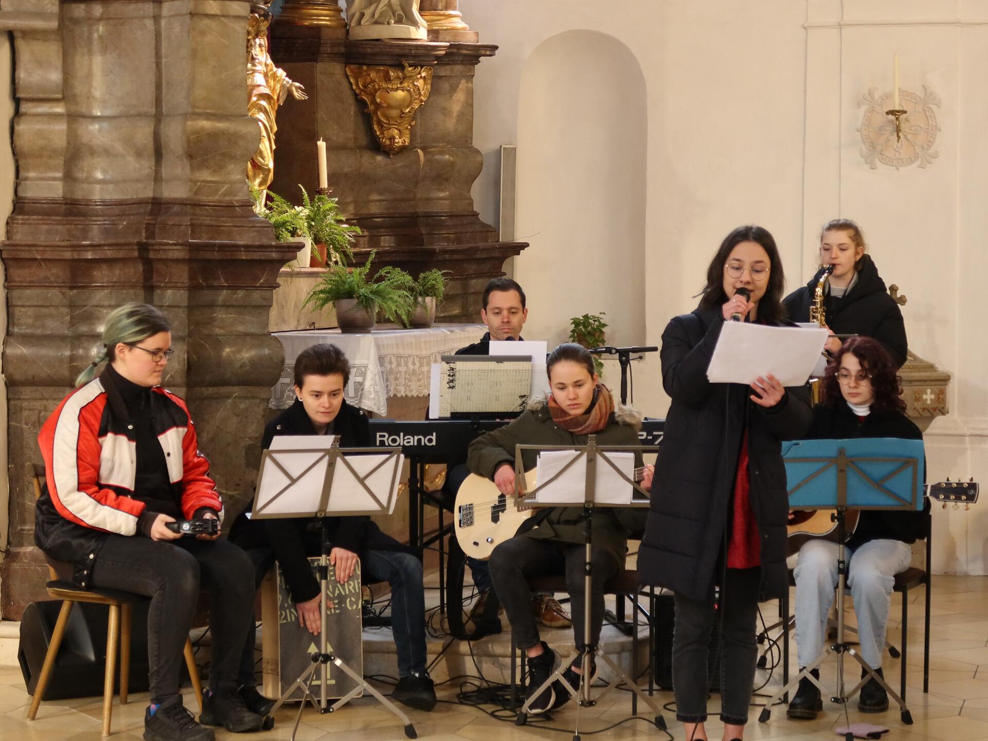 Einer erklang gleich zu Beginn. Mit schwungvollen bis fetzigen Liedern begleitete die Band „Concino“ unter der Leitung von Fabian Mnich den Gottesdienst und lud - wie der Name sagt - natürlich auch zum Mitsingen ein. Dazu begeisterte die Musikgruppe aus ehemaligen Schülerinnen der Maria-Ward-Realschule mit Instrumentalliedern und dem Sologesang von Leonie Höger.