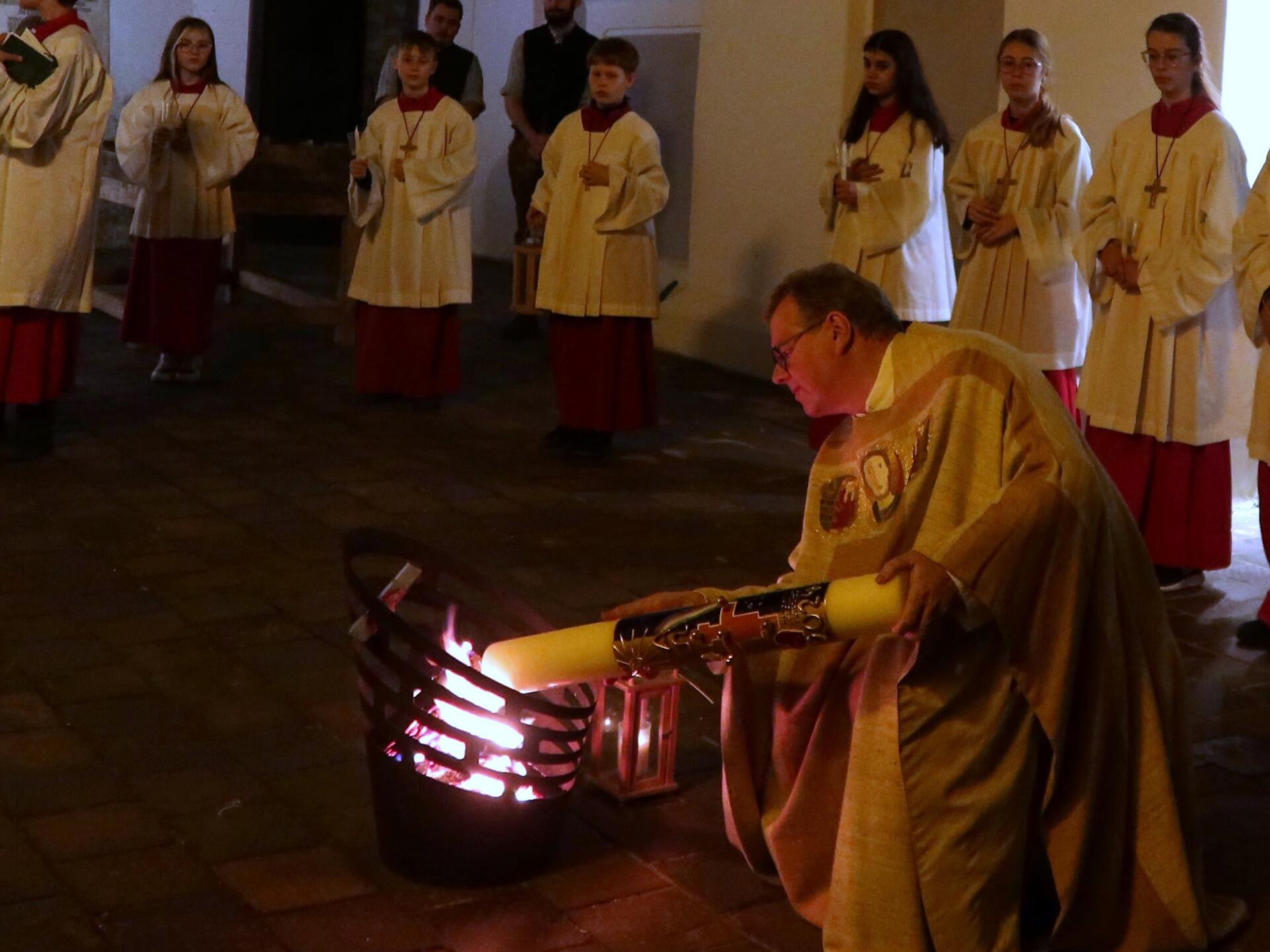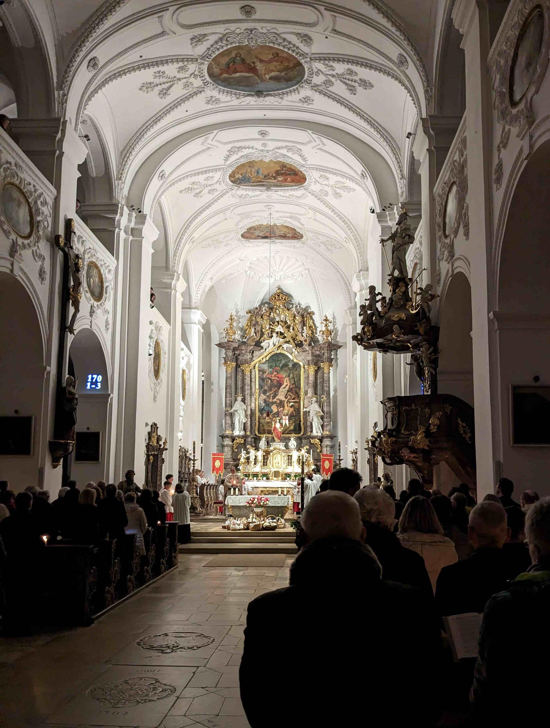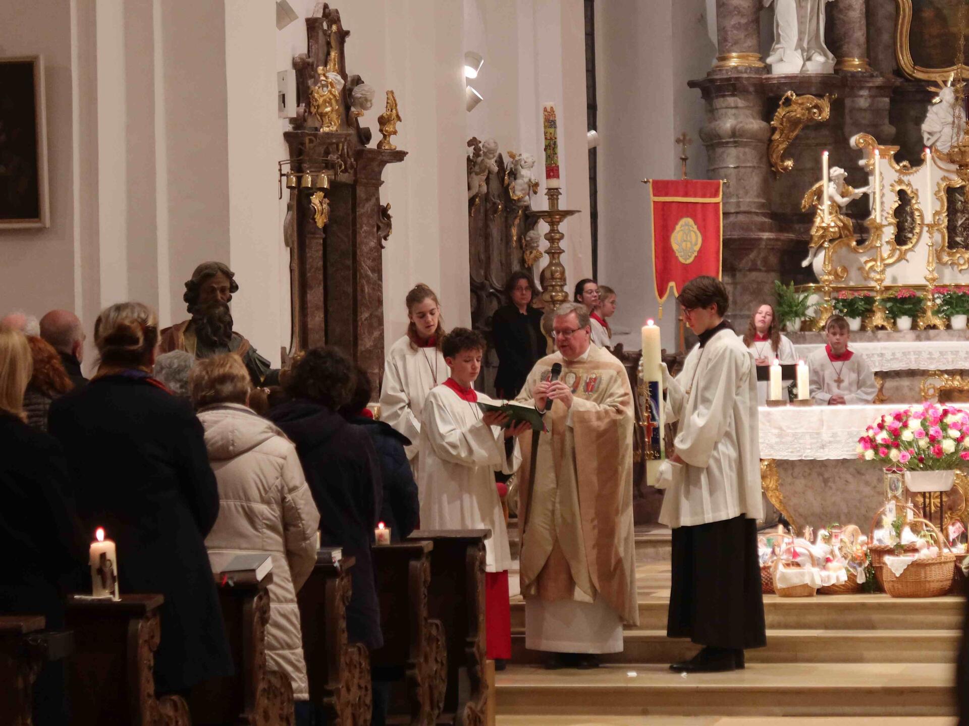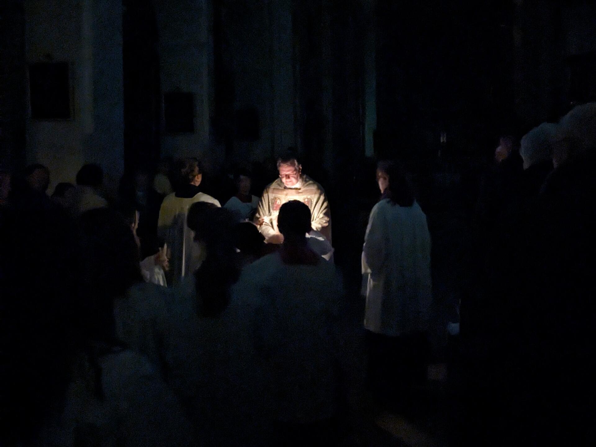 Am Karsamstag, dem Tag der Ruhe und Vorbereitung, feierte Pfarrer Leutgäb in der Hofkirche eine Trauermette, die von eine Schola aus dem Kirchenchor musikalisch gestaltet wurde, bevor am Abend die ersten Osternachtsfeiern begannen.