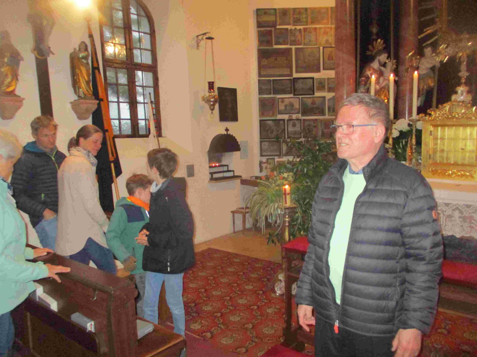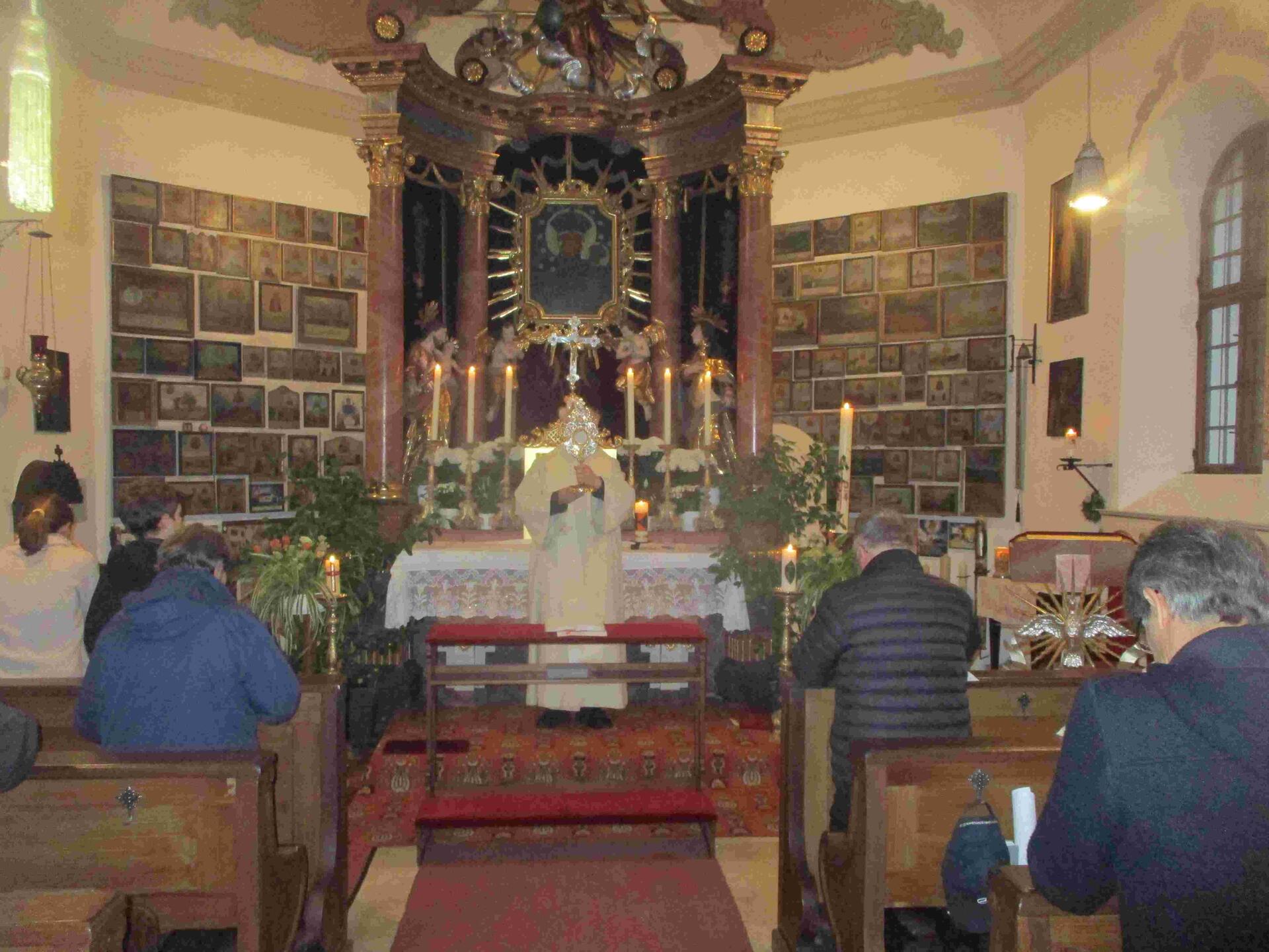 Vorstandsmitglied und Liturgie-Beauftragter Hans Omasreiter hatte eine stimmungsvolle Mai-Andacht zusammengestellt, die von Präses Msgn. Vitus Wengert geleitet wurde. Mit Marienliedern wie „Gegrüßet seist du, Königin“, „Maria, dich lieben ist allzeit mein Sinn“, „Maria breit den Mantel aus“, „Freu dich du Himmelskönigin“ und „Sakrament der Liebe Gottes“ sowie passenden Gebeten zur Muttergottes, vorgetragen vom Priester und von Lektoren erlebten die 25 Gläubigen eine eindrucksvolle Marienverehrung. Im Rahmen der Fürbitten wurde eine Kolping-Kerze am Altar entzündet und u.a. für die Opfer des unseligen Ukraine-Krieges gebetet. Zum Abschluss der Maiandacht spendete Präses Wengert mit dem Allerheiligsten den Segen und das wunderschöne Lied „Segne du Maria, segne mich dein Kind, dass ich hier den Frieden, dort den Himmel find!“ passte genau zu dieser Mai-Andacht in der gnadenreichen Kahlhofkapelle. Danach traf sich die Kolpingfamilie in der Garage von Familie Felbermeir bei einer stärkenden Brotzeit zu einem gemütlichen Beisammensein.