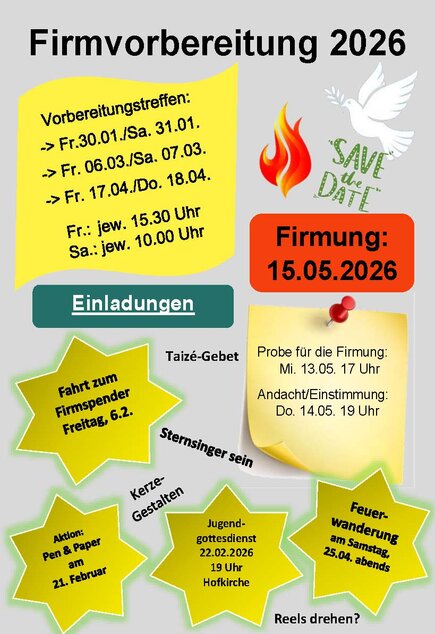 Interessierte Eltern der Firmlinge sind am 27. Februar 2026 eingeladen. Wir wollen an diesem Abend über die Firmung ins Gespräch kommen: z. B. Was bedeutet die Firmung? Warum jetzt?