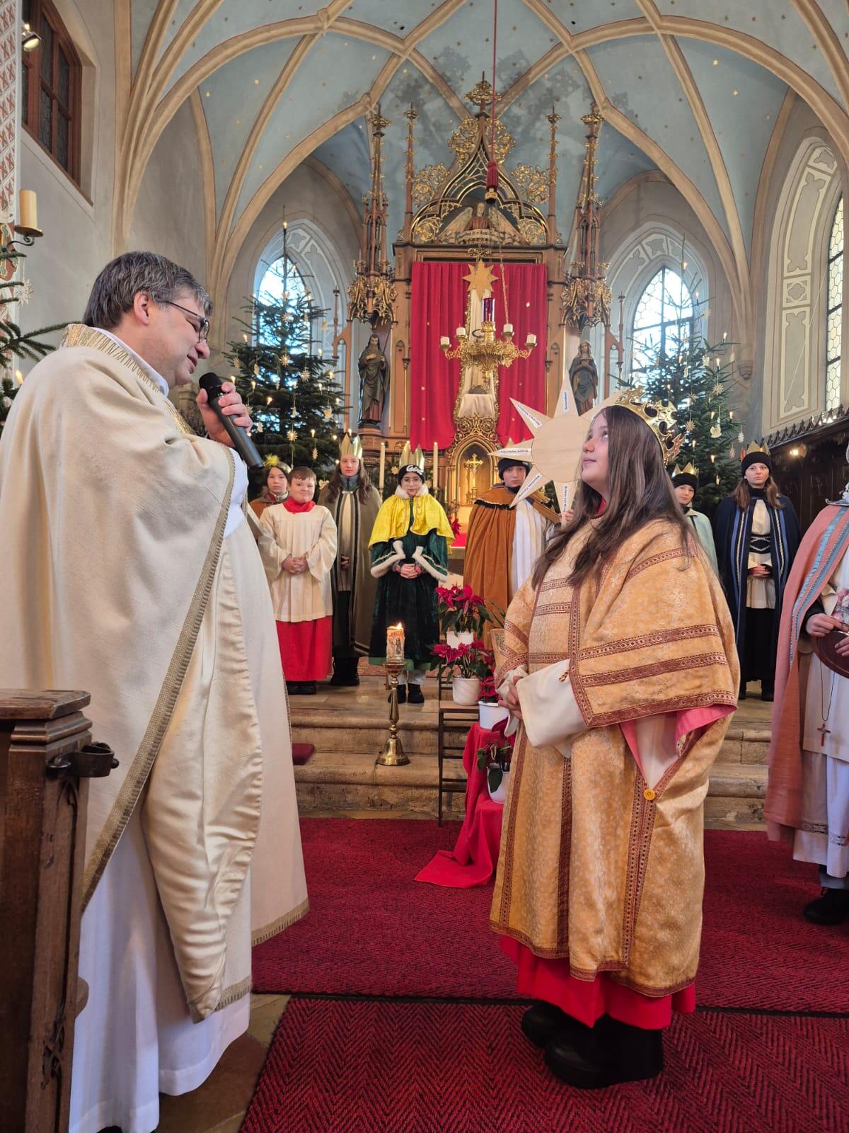 (Petra Karpf) Im Rahmen der Sternsinger-Aussendung wurde im Gottesdienst Alena Braun feierlich in die Gemeinschaft der Ministrantinnen und Ministranten aufgenommen. Mit ihrer Zusage erklärte sie ihre Bereitschaft, künftig den Dienst am Altar zu übernehmen und sich aktiv in das Gemeindeleben einzubringen.